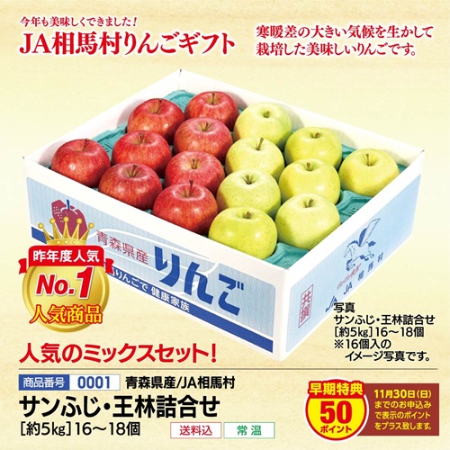 0001)青森県JA相馬村 サンふじ・王林詰合せ (約5kg)16~18個