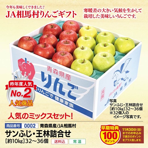 0002)青森県JA相馬村 サンふじ・王林詰合せ (約10kg)32~36個