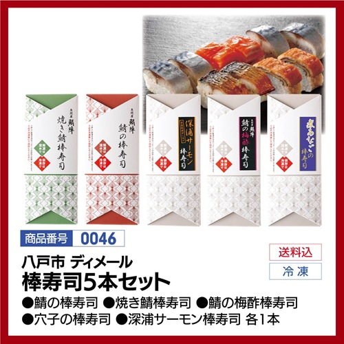 ●鯖の棒寿司 ●焼き鯖棒寿司 ●鯖の梅酢棒寿司 ●穴子の棒寿司 ●深浦サーモン棒寿司 各1本