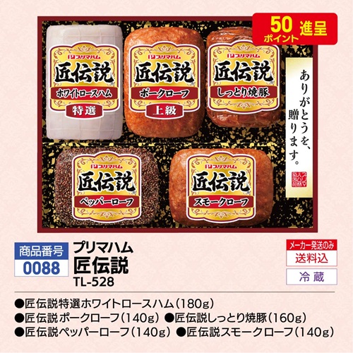 ●匠伝説特選ホワイトロースハム(180g) ●匠伝説ポークローフ(140g) ●匠伝説しっとり焼豚(160g) ●匠伝説ペッパーローフ(140g)●匠伝説スモークローフ(140g)