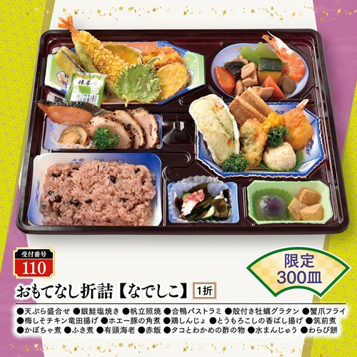 ●天ぷら盛合せ ●銀鮭塩焼き ●帆立照焼 ●合鴨パストラミ ●殻付き牡蠣グラタン ●蟹爪フライ●梅しそチキン竜田揚げ ●ホエー豚の角煮 ●鶏しんじょ ●とうもろこしの香ばし揚げ ●筑前煮●かぼちゃ煮 ●ふき煮 ●有頭海老 ●赤飯 ●タコとわかめの酢の物 ●水まんじゅう ●わらび餅