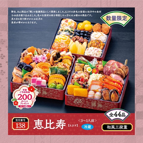 ◆筑前煮 ◆梅型人参 ◆椎茸煮 ◆蓮根煮 ◆子持ちわかさぎ昆布 ◆高野豆腐 ◆紅あずま甘露煮 ◆ローズサーモン ◆トラウ トサーモン西京焼き ◆チキン三色巻き ◆合鴨ロース照り焼き風 ◆合鴨スモーク ◆市松蒲鉾 ◆中華帆立ひも ◆にしん奉書 巻き ◆伊達巻 ◆若桃甘露煮