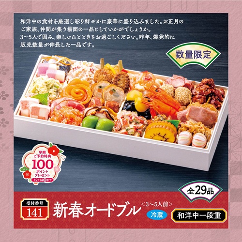 ◆にしん大漁漬け ◆市松蒲鉾 ◆若草チーズ和え ◆サーモンクリームチーズ和え ◆鮭チーズオードブル ◆海の幸サラダ ◆ローズサーモン ◆ローストポーク ◆サーモン塩麹漬け ◆彩り野菜のマリネ ◆鶏つくね串 ◆チキン三色巻き ◆合鴨スモーク ◆中華タコ山菜 ◆若桃甘露煮 ◆海鮮マリネ ◆黒豆 ◆栗甘露煮 ◆イカのゴロゴロサラダ ◆ポークパストラミ ◆ゴマ団子 ◆有頭海老塩焼き ◆穀類の甘辛煮 ◆伊達巻 ◆酢豚 ◆中華くらげ ◆合鴨串照り焼き ◆中華帆立ひも ◆京餅手まり