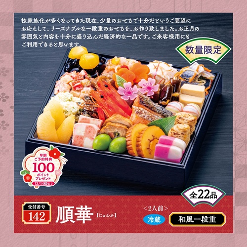 核家族化が多くなってきた現在、少量のおせちで、十分だというご要望にお応えして、リーズナブルな一段重のおせちを、お作り致しました。お正月の雰囲気と内容を十分に盛り込んだ経済的な一品です。