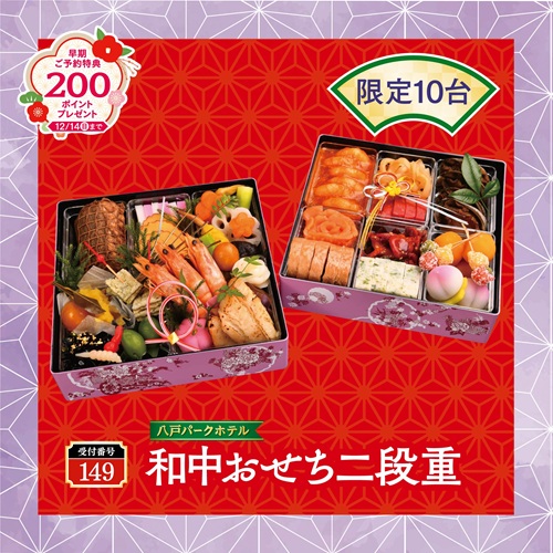 〈日本料理〉 ◆ローストビーフ◆紅白蒲鉾◆伊達巻◆葉付き金柑◆花蓮根◆姫慈姑松笠◆手綱こんにゃく◆千社唐◆梅人参◆椎茸◆蕨(木の芽) ◆栗金団◆黒豆(金箔)◆子持ち昆布ダイスカット◆若桃甘露煮◆活鮮ボイルエビ◆百合根甘露煮◆花餅紅梅◆花餅白梅